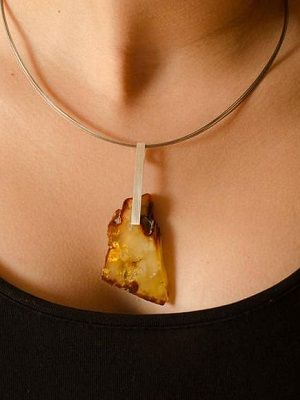 Янтарное украшение из золота с неоднородным рисунком лучше всего будет смотреться на однотонной одежде насыщенных и ярких оттенков. В некоторых случаях такое ожерелье уместно смотрится с цветастыми платьями. Главное условие – кулон или бусы должны быть представлены в светлой палитре.