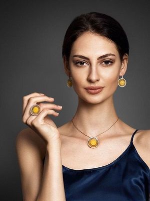 Брюнеткам и шатенкам стоит присмотреться к украшениям из светлых минералов. Это могут быть экземпляры с медовым, королевским молочным и лимонным оттенком. Также обладательницам темных прядей отлично подходят аксессуары с желтыми и красными самоцветами.